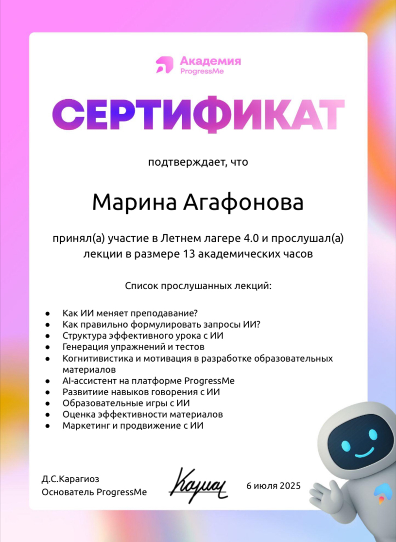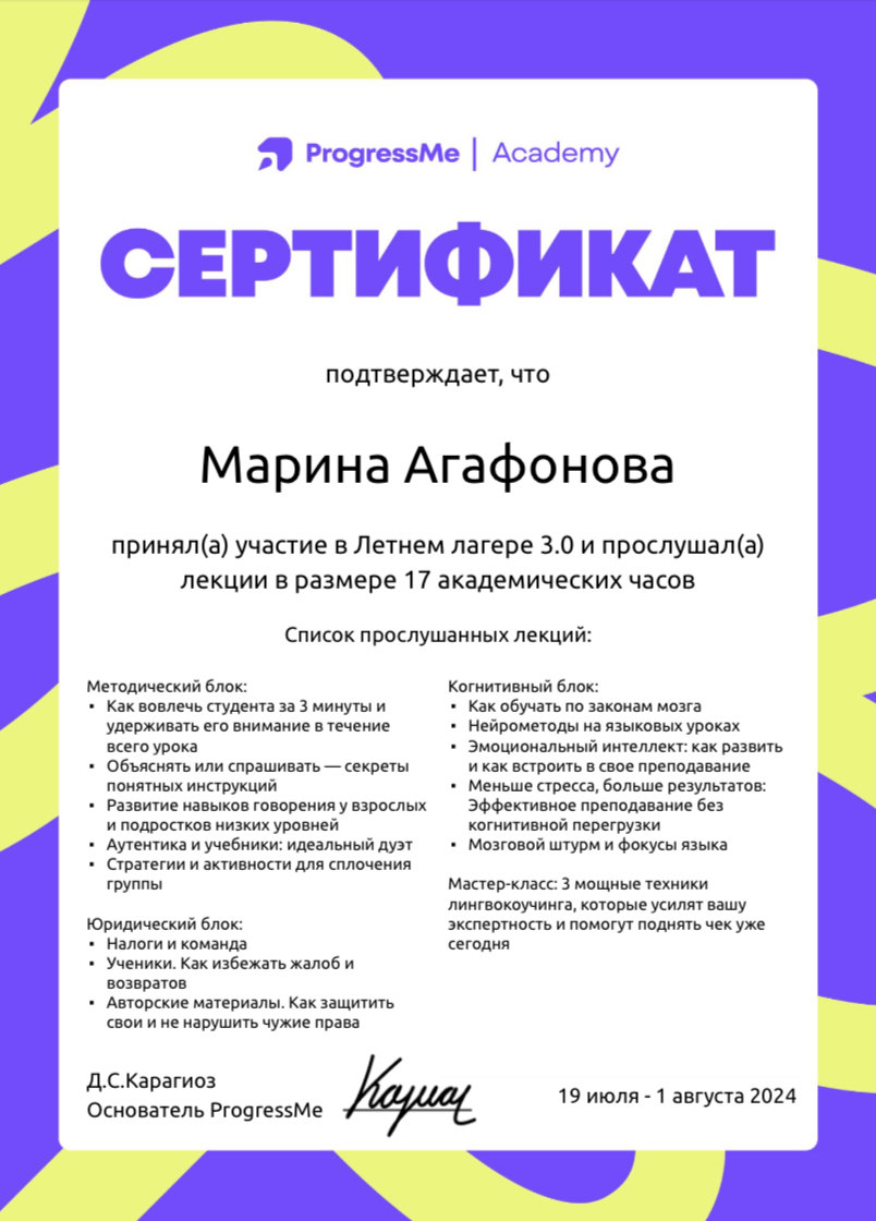 Я веду занятия в группах и индивидуально под запрос, имею опыт работы 3+ лет, степень магистра в лингвистике, разрабатываю материалы с нуля и помогаю вам получать удовольствие от обучения :)...