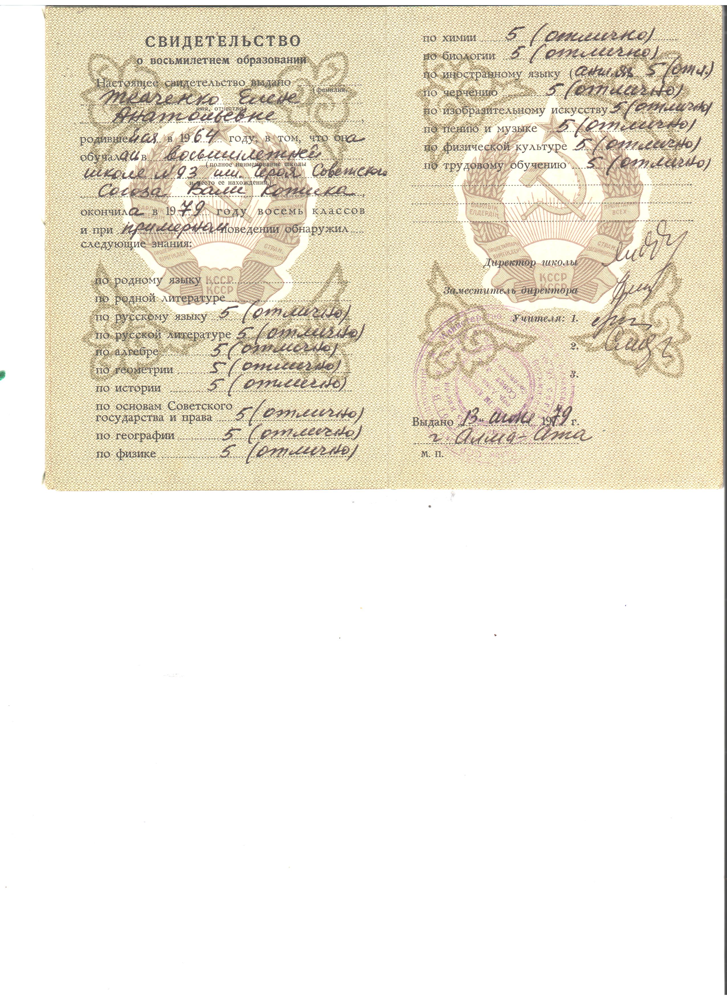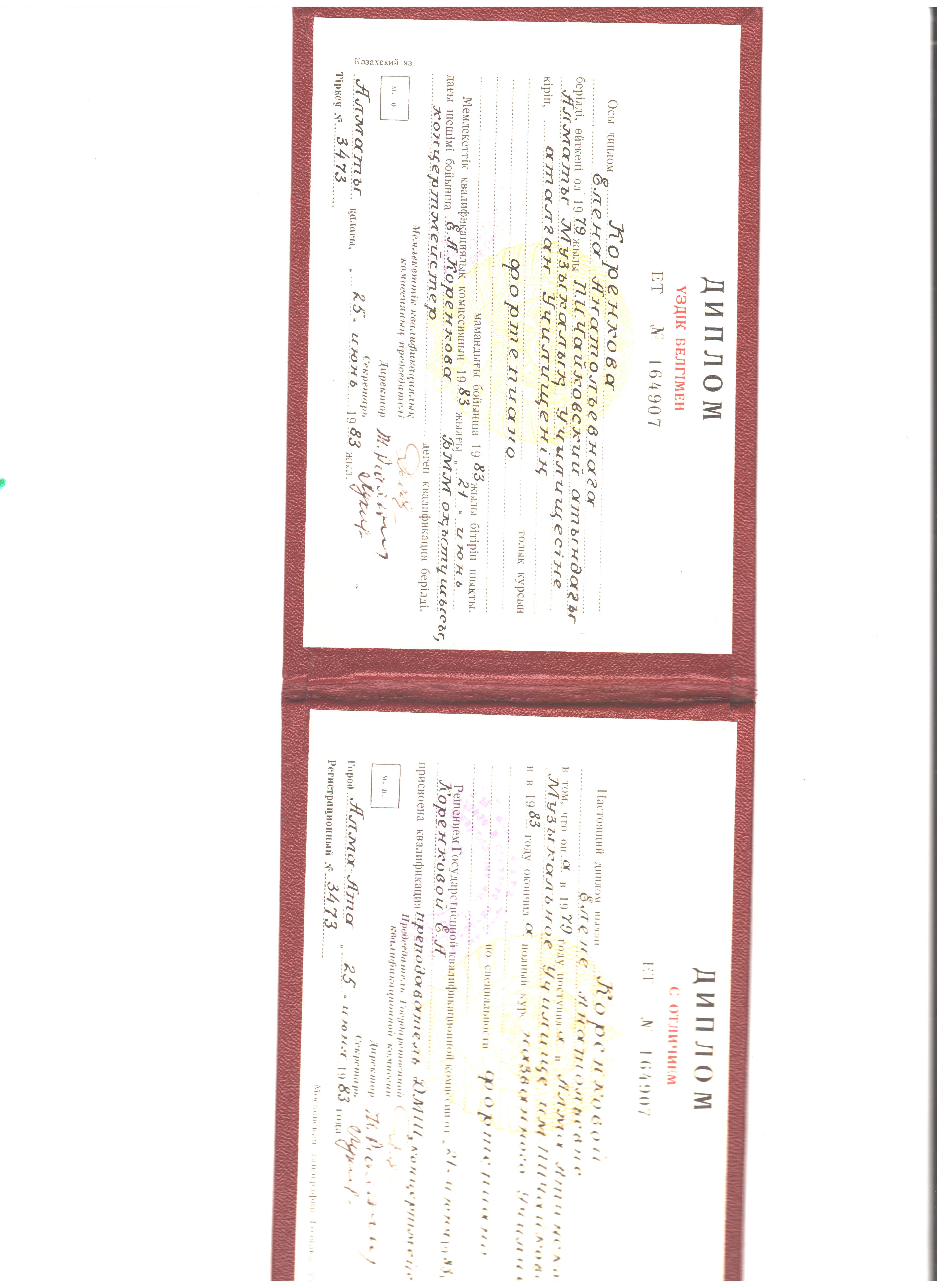 Образование: Алма-Атинское музыкальное училище им. Чайковского с отличием в 1983 году по специальности фортепиано, квалификация: преподаватель ДМШ, концертмейстер.