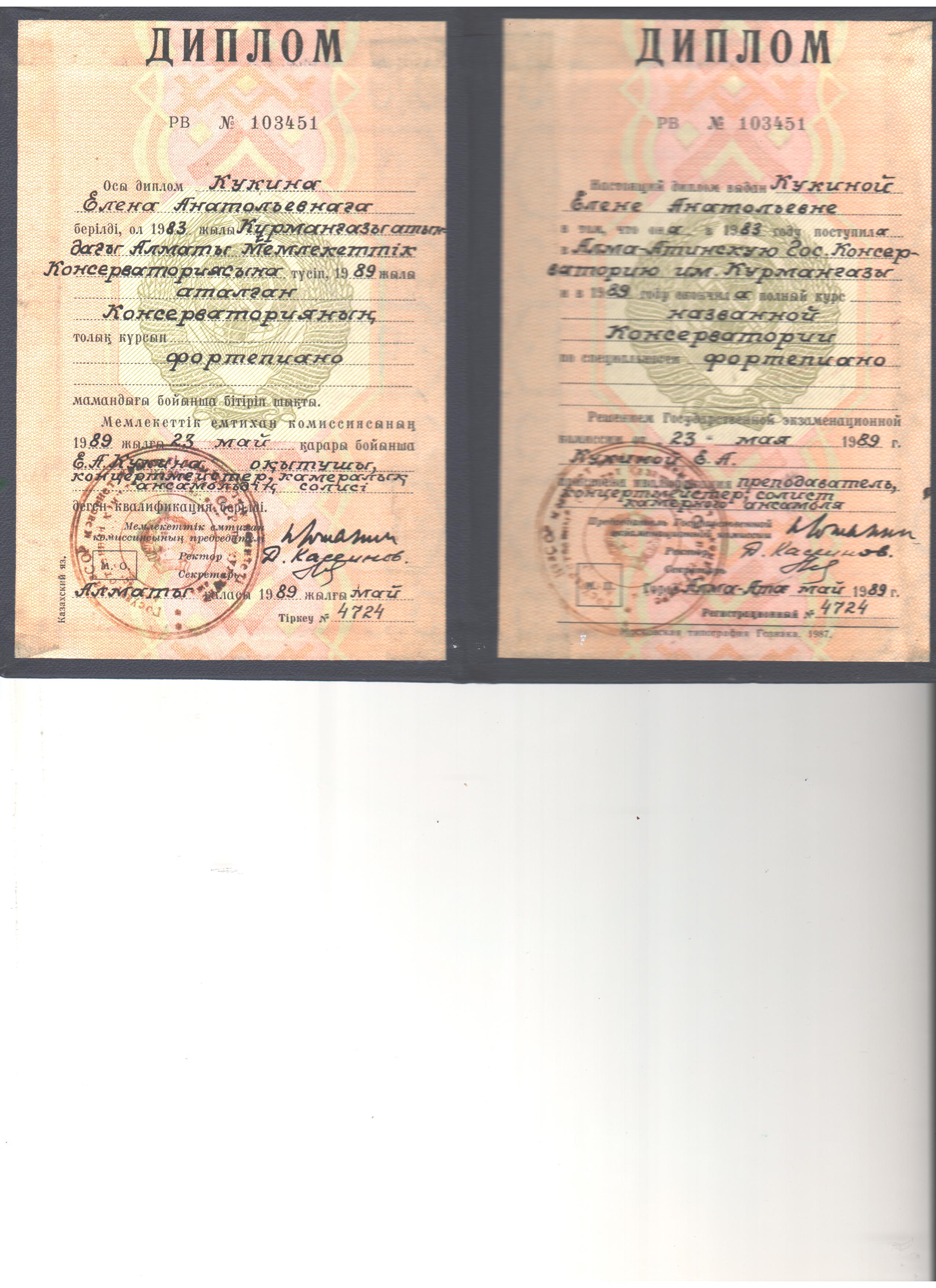 Дополнительная информация: Алма-Атинская государственная консерватория в 1989 году по специальности фортепиано, квалификация: преподаватель, концертмейстер, солист камерного ансамбля.