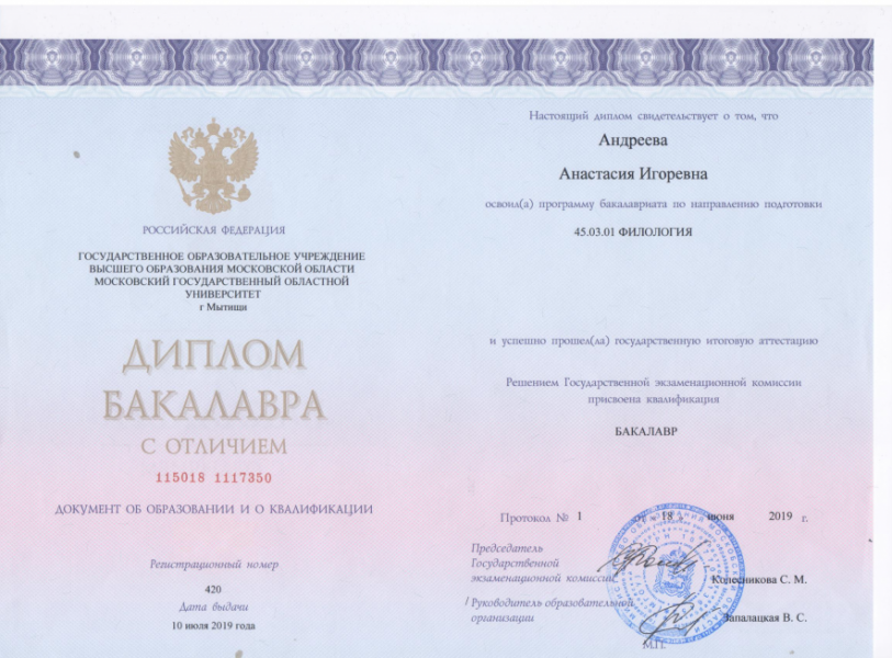 Получила диплом МГОУ с отличием по специальности «Отечественная филология».