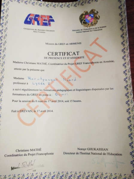 Комментарий: имею опыт в общении с учениками.Опыт преподавание 14 лет.Имею сертификаты по квалификации французского языка.Свободно владею и общаюсь на французском.С 2007г. работала во французской общественной организации переводчиком.
