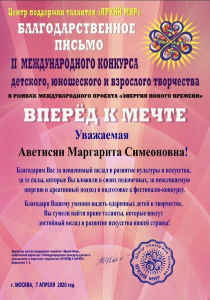 • Лауреатство на ll Международном конкурсе детского, юношеского и взрослого творчества «Вперёд к мечте»; Лауреатство на Международном Фестивале-конкурсе «Огни большого города»;
