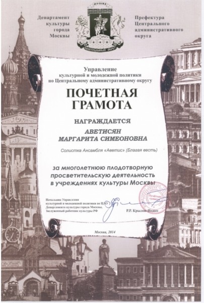 Награждена Почётной грамотой Департамента культуры города Москвы «За многолетнюю плодотворную просветительскую деятельность в учреждениях культуры Москвы» 2014г.