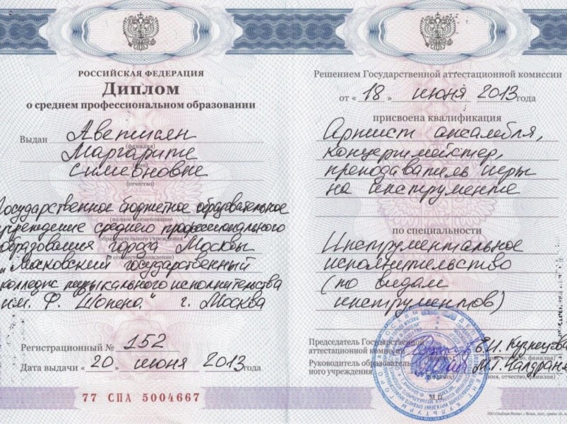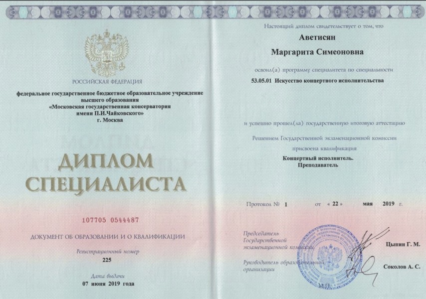 Образование: Окончила Московский государственный колледж музыкального исполнительства им. Ф. Шопена, специальность – фортепиано, артист ансамбля, концертмейстер, преподаватель игры на инструменте. 2013г.
