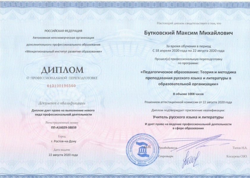 Межрегиональный институт развития образования, Профессиональная переподготовка по программе «Педагогическое образование», 2020 г.