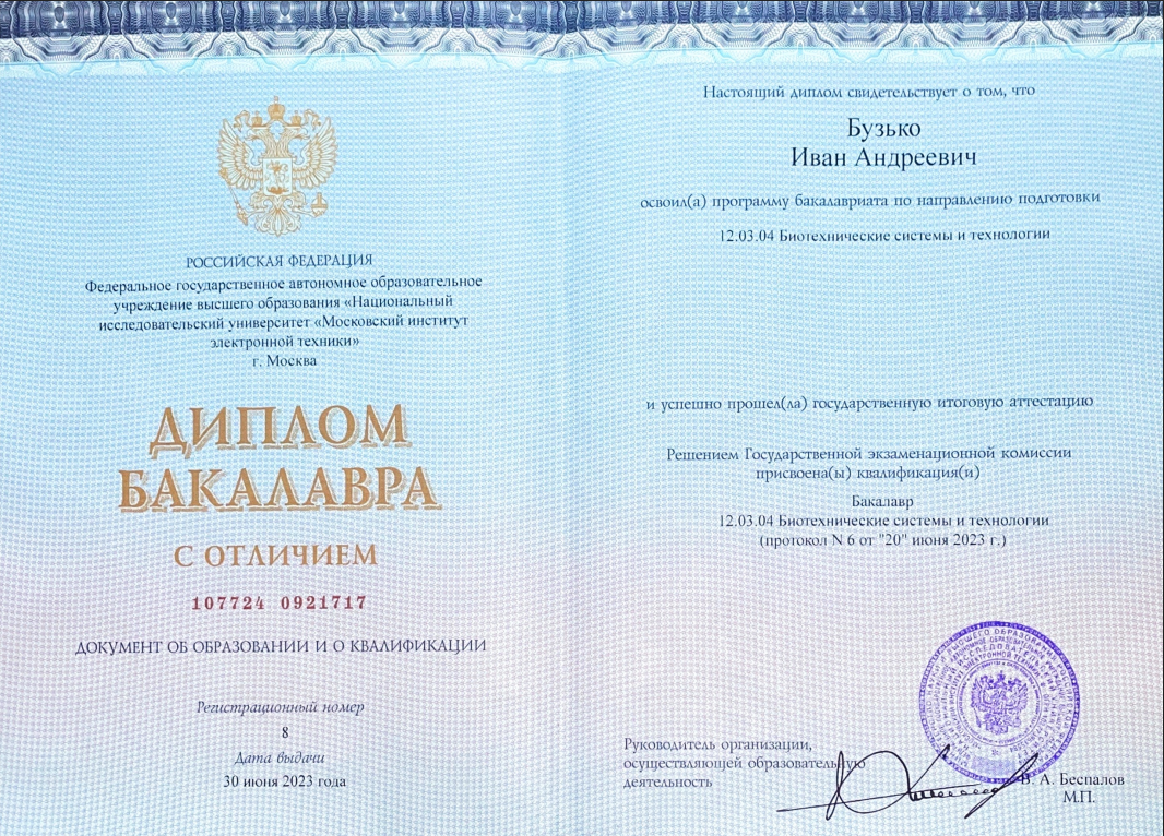 - Образование: НИУ МИЭТ, Инженер биотехнических систем, 2023