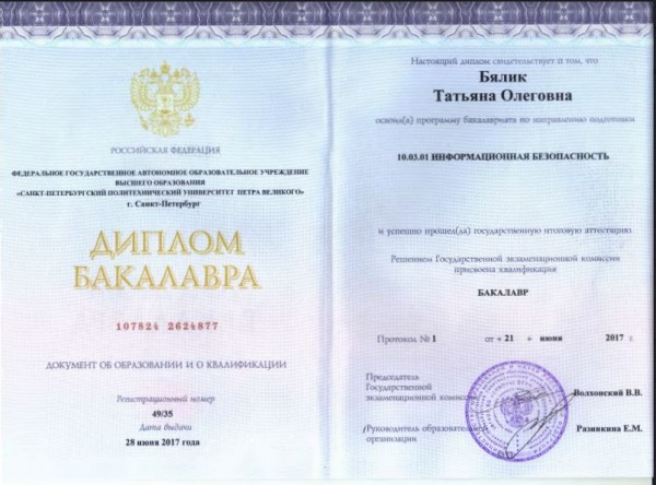 - Образование: Санкт-Петербургский Политехнический университет имени Петра Великого, Институт компьютерных наук и технологий, бакалавр
