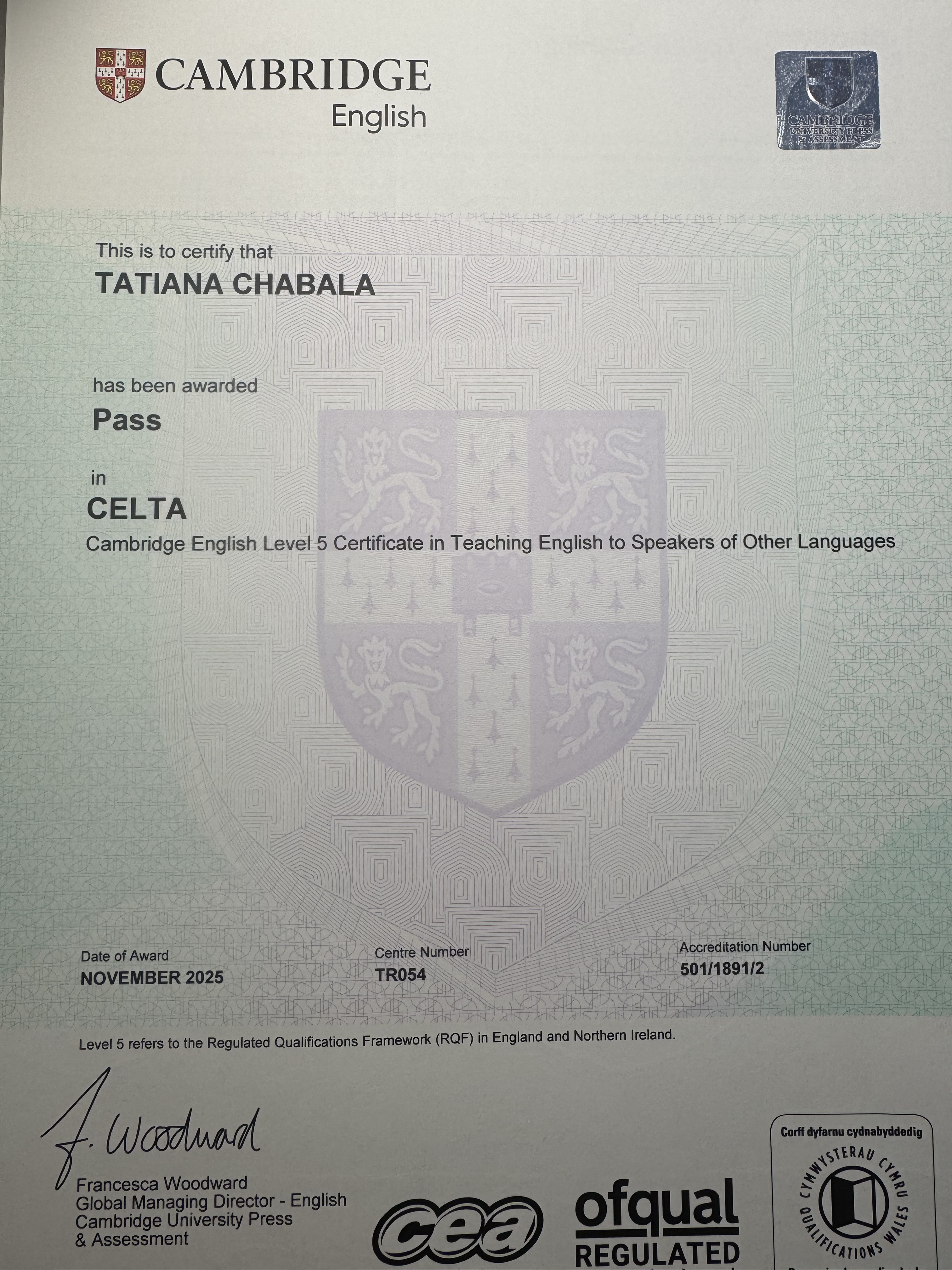 Закончила международный курс для преподавателей английского языка CELTA, Cambridge.