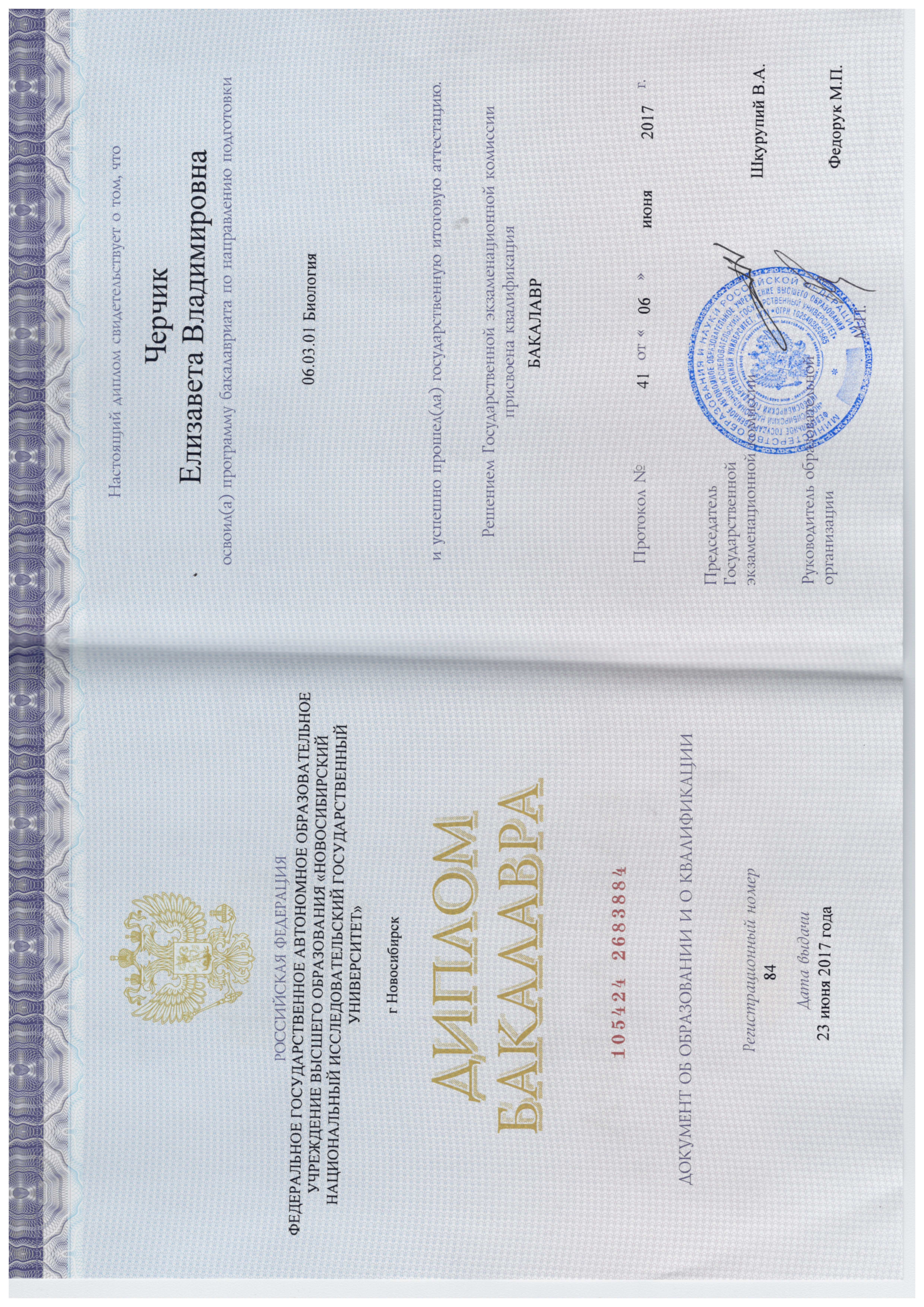 - Образование: Новосибирский Государственный Университет, биология, 2017 г.