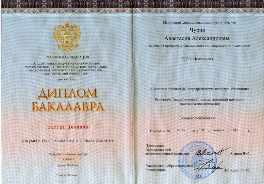 Образование: Московский государственный психолого-педагогический университет, факультет психологии образования, направление – психология, 2015 год.