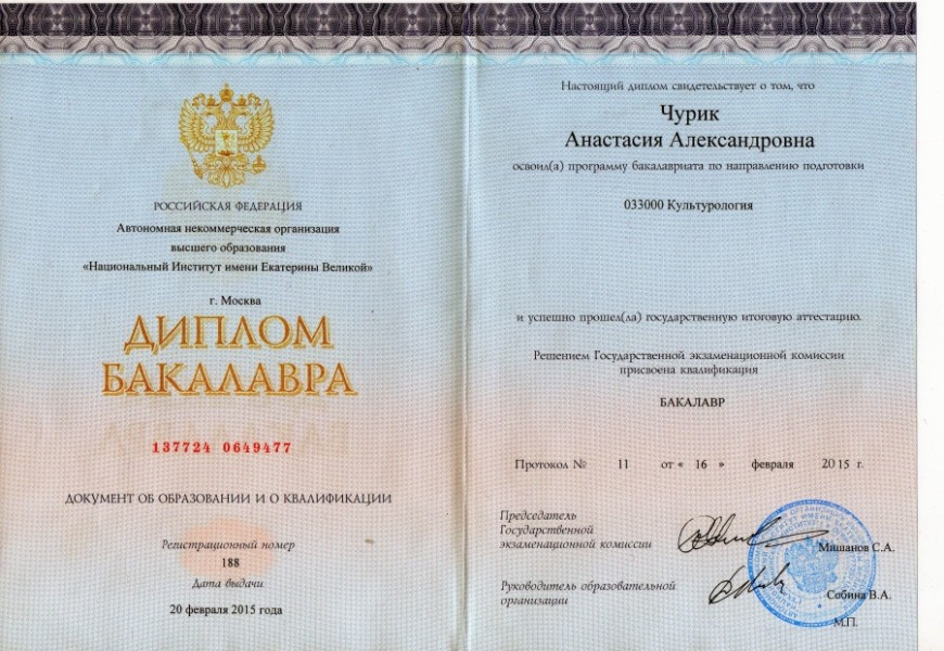 Национальный институт имени Екатерины Великой, гуманитарный факультет, направление – культурология (2015 г.).