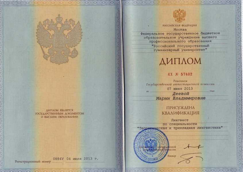 Образование: В 2013 году окончила РГГУ, Институт лингвистики, специальность – теоретическая и прикладная лингвистика, специализация – языки и теория коммуникации.