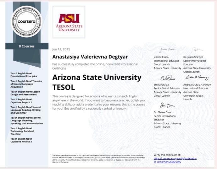 - Являюсь международным преподавателем английского - проходила онлайн-обучение в американском университете штата Аризоны и имею сертификат TESOL, который дает мне право преподавать английский по всему миру