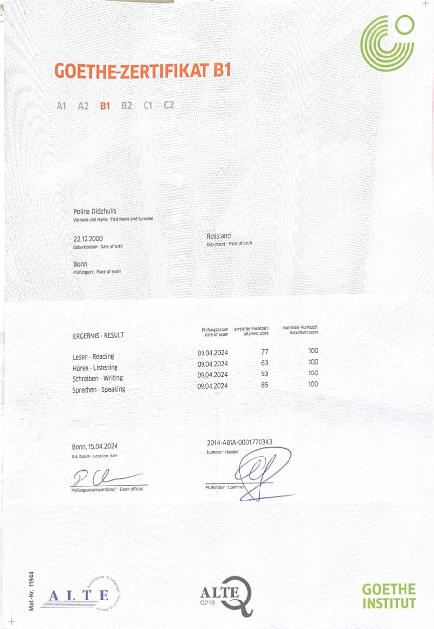 Есть официальный сертификат Goethe В1 от апреля 2023 года.