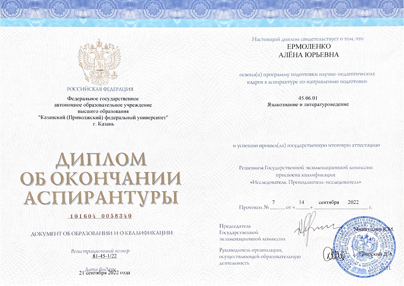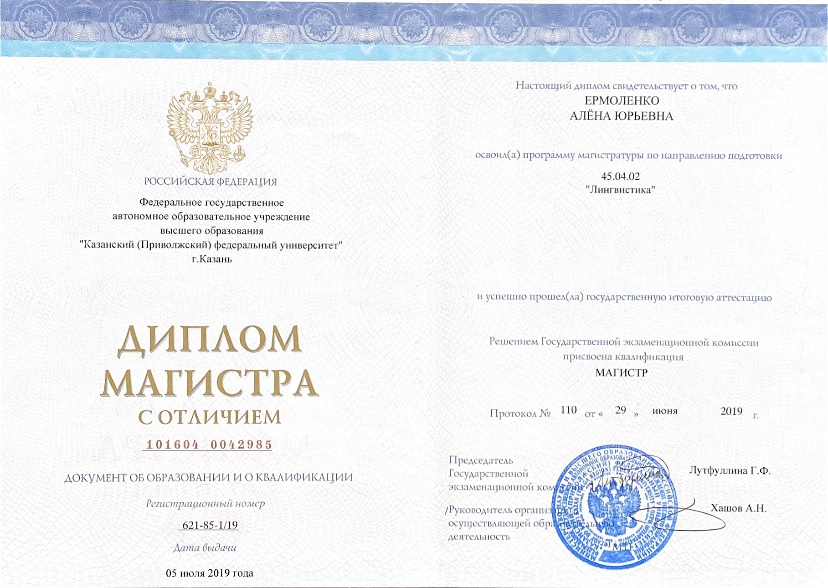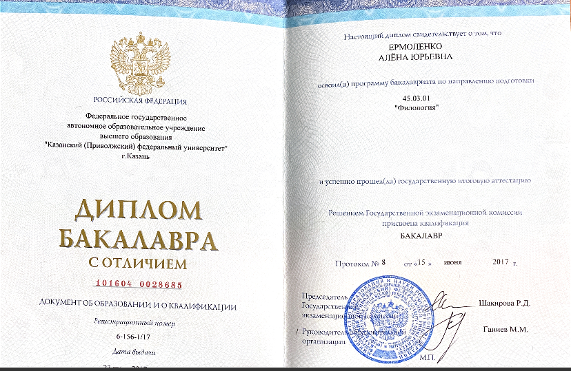 Закончила факультет романо-германской филологии Казанского федерального университета (бакалавриат - зарубежная филология, магистратура - лингвистика, аспирантура - сравнительное языкознание). Написала диссертацию.