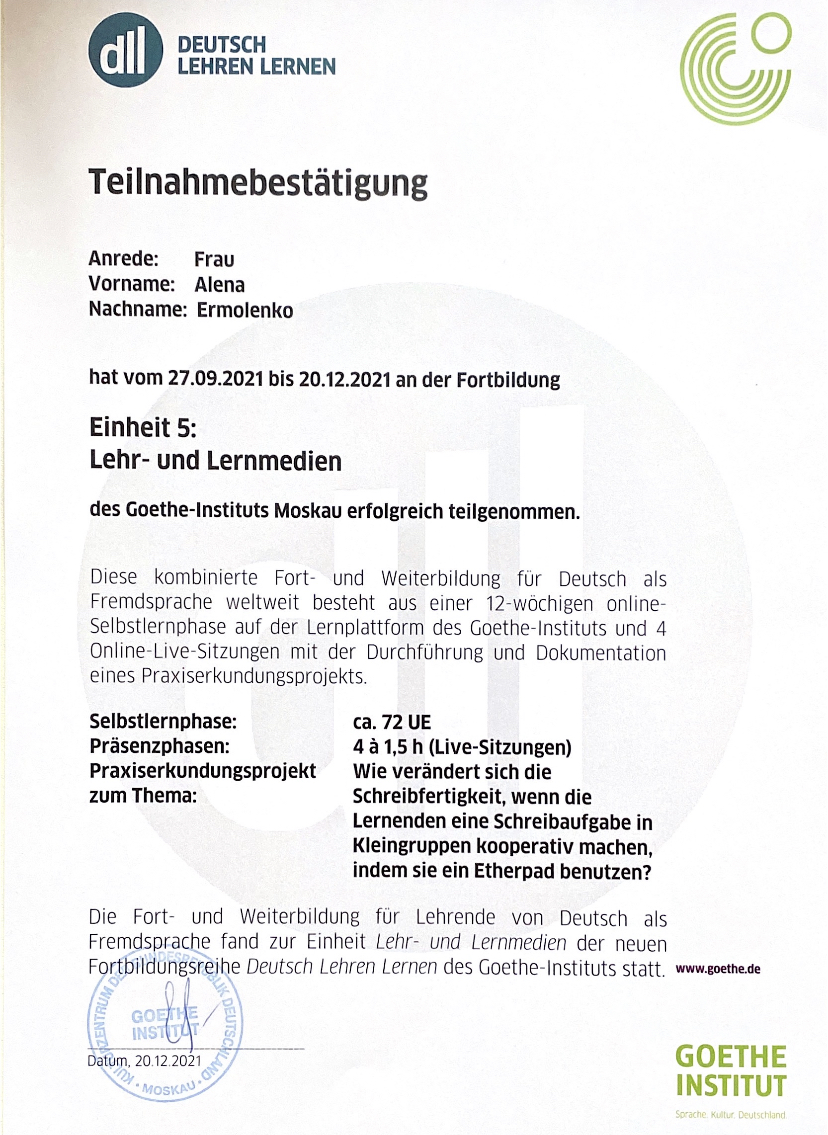 Повышение уровня немецкого языка от A1 до В1. Готовлю к сдаче Goethe-Zertifikat