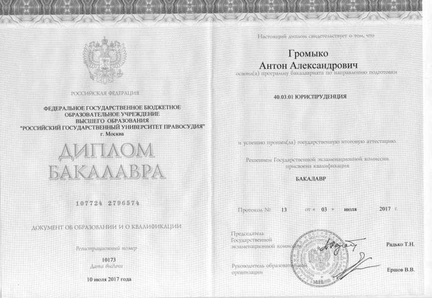 Образование: Российский государственный университет правосудия(РГУП) по специальности юриспруденция. Степень Бакалавра. В данный момент обучаюсь на магистратуре в Московском университете имени С.Ю.Витте.