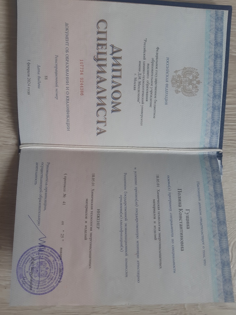 Образование: 1 высшее - "Инженер" по специальности "Химическая технология органических соединений азота". Факультет ИХТ.