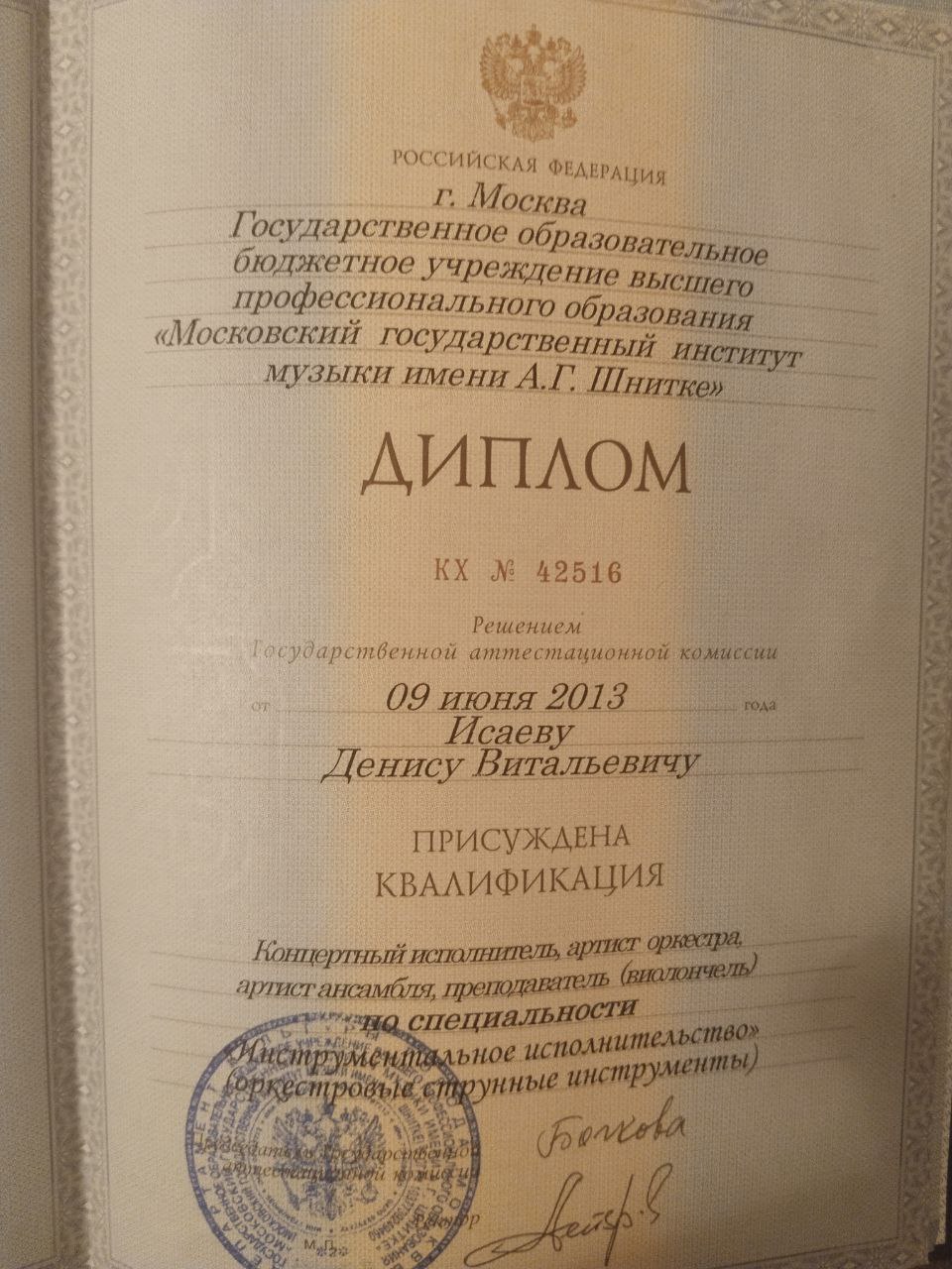 Образование: МГИМ им. Шнитке, факультет инструментального исполнительства, класс профессора Евграфова Л.Б.– виолончель