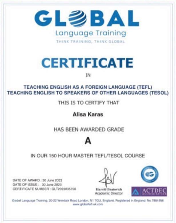 Образование: Сертификат TESOL 150 hours Grade A, аккредитация ACTDEC (международная сертификация преподавателей английского для не-носителей языка)
