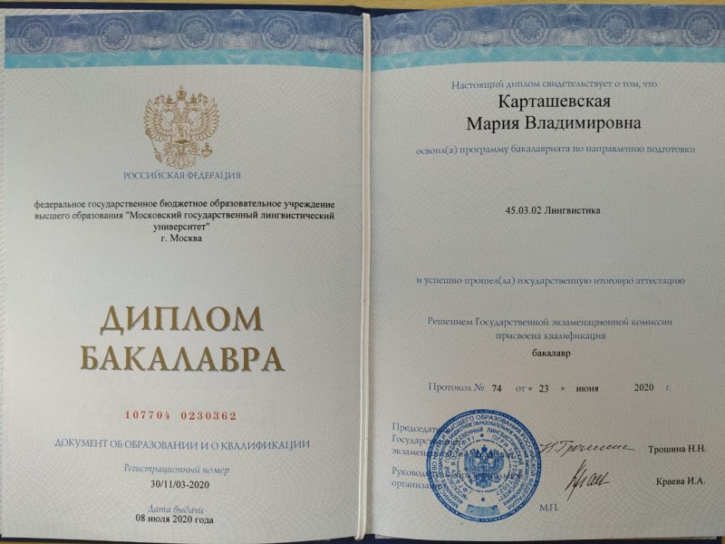 ~2016-2020 училась в МГЛУ. Степень бакалавра.