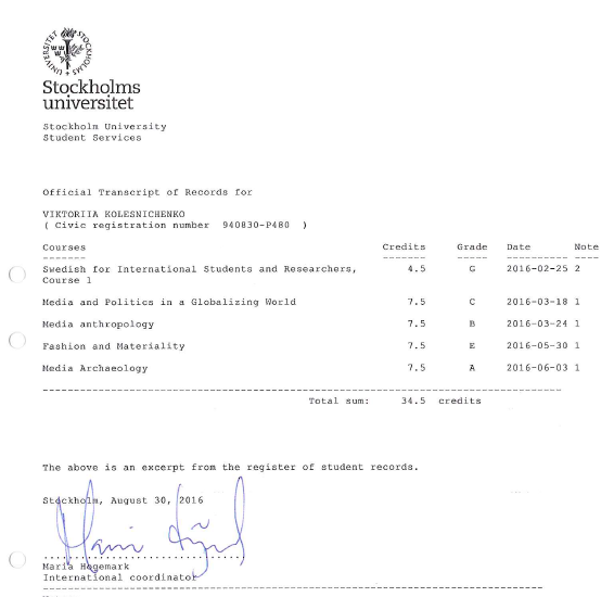 Стокгольмский университет (Стокгольм, Швеция), 2016 г. - учеба по обмену.