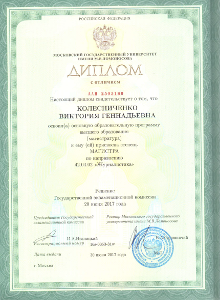 Магистратура: факультет журналистики МГУ имени М.В. Ломоносова (диплом с отличием), 2015-2017 гг.