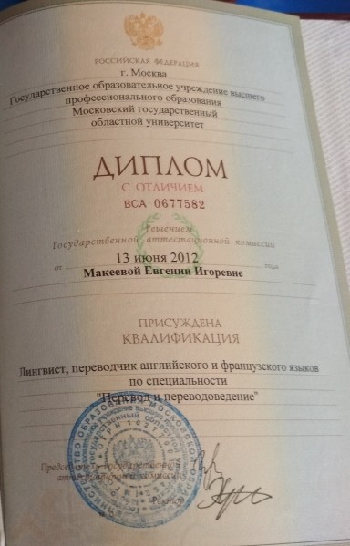 Образование: МГОУ, лингвист - переводчик, 2012 г.