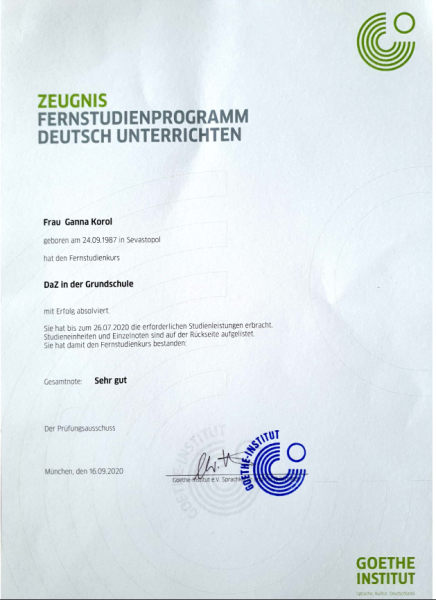 Сертификат Гёте-Института “Немецкий как иностранный для дошкольников и учащихся начальных классов”, Германия