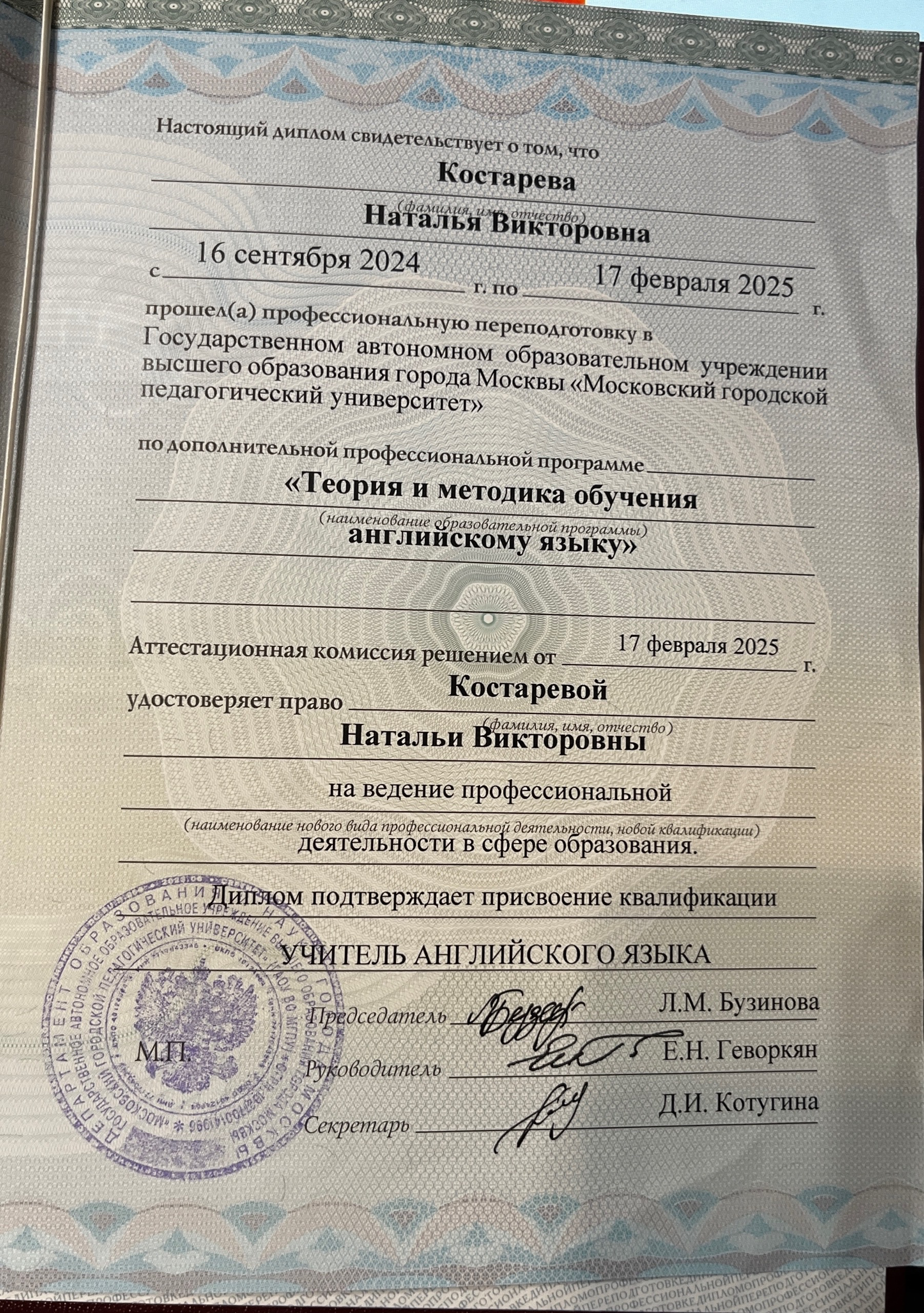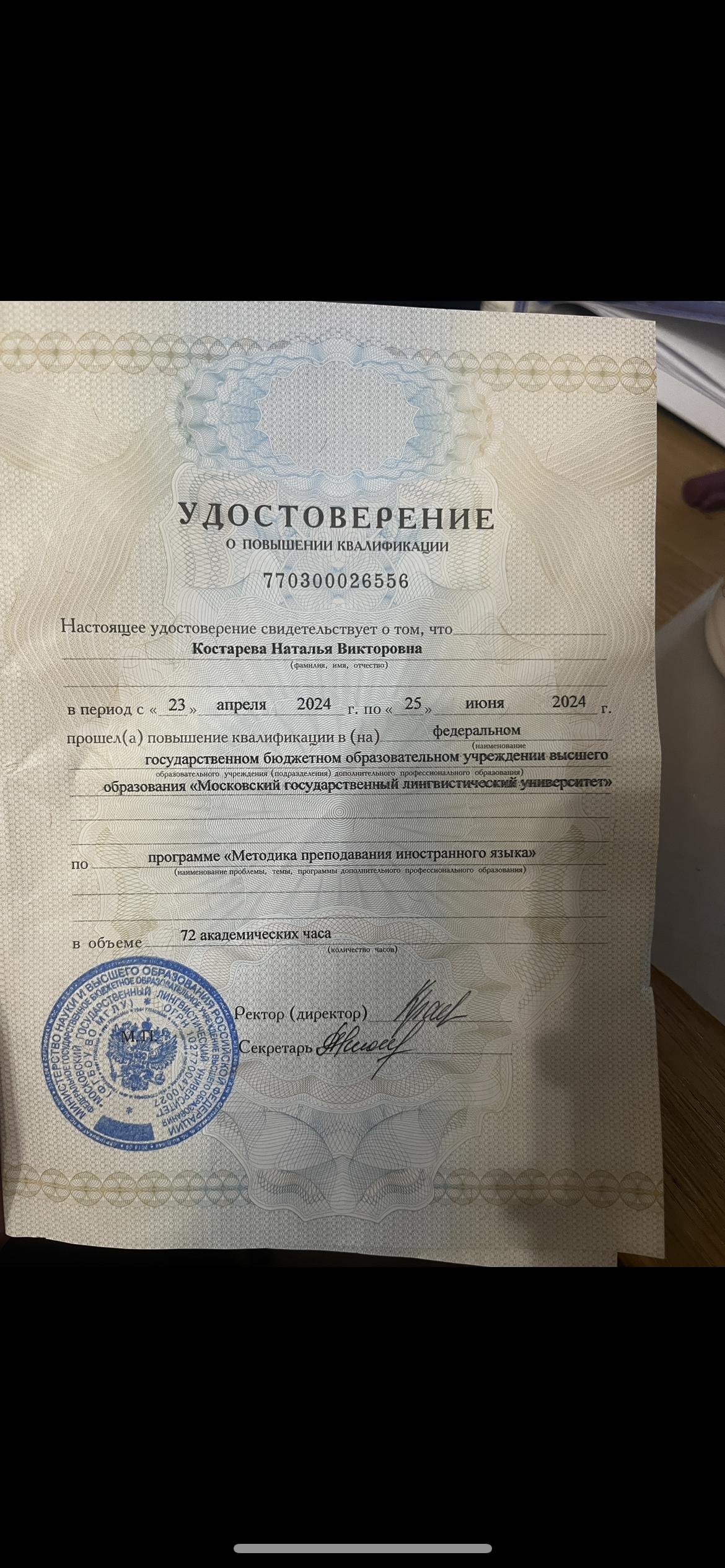 Сертификаты Московского Государственного Лингвистического Университета 2022, Московского Государственного Педагогического Университета 2023 преподавателя, Cambridge English Certificate. Набрала 93 по TOEFL (Это международный экзамен, который принимается университетами 190 стран.)