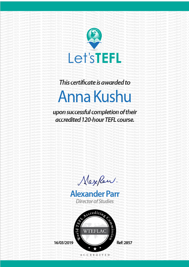 Привет! Я преподаю английский уже более 8 лет. Имеется международный сертификат TEFL, позволяющий преподавать английский в любой точке мира.