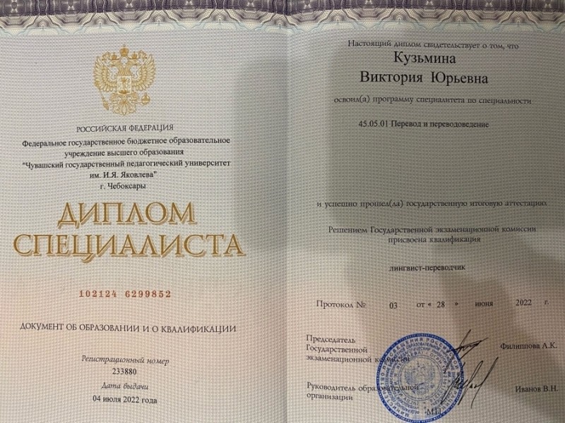 Имею высшее образование по специальности - Перевод и переводоведение.