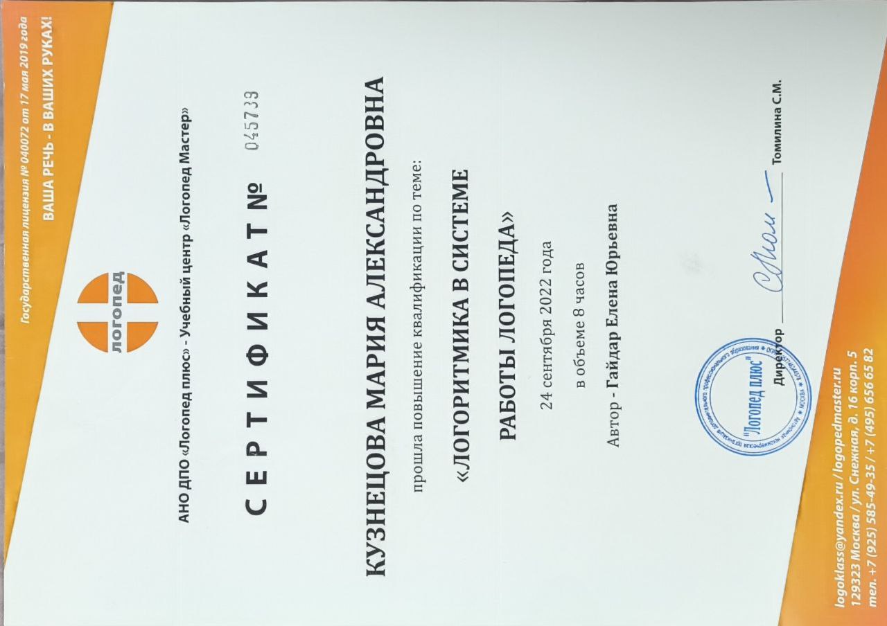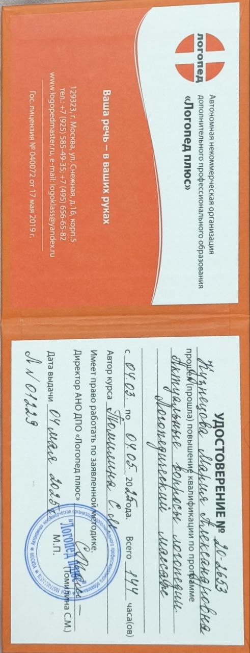 Имею среднее медицинское образование, окончила курсы классического массажа и повышение квалификации по логомассажу.
