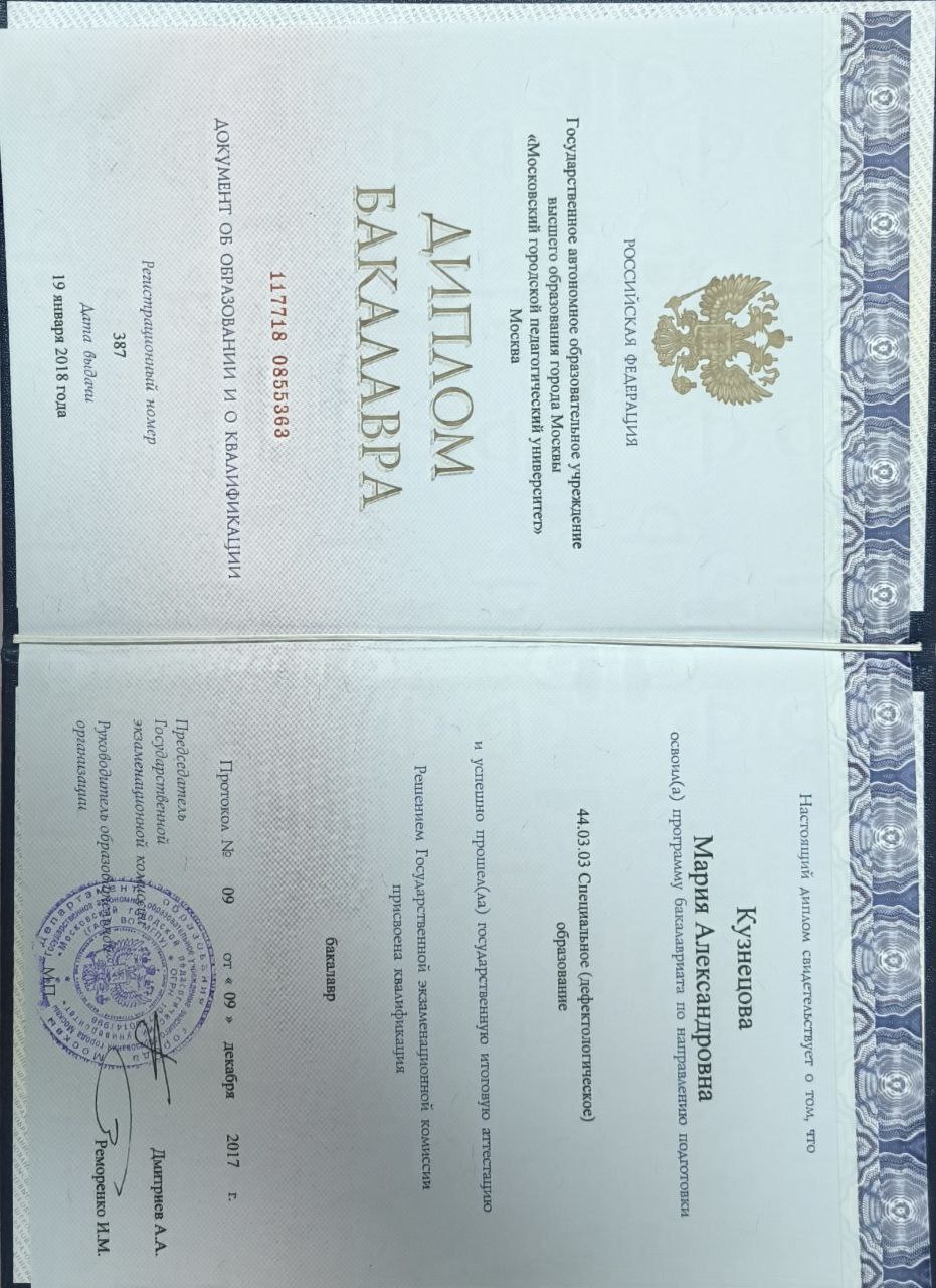 - Образование: бакалавр "Специальное (дефектологическое) образование