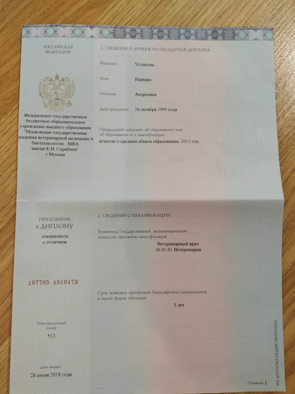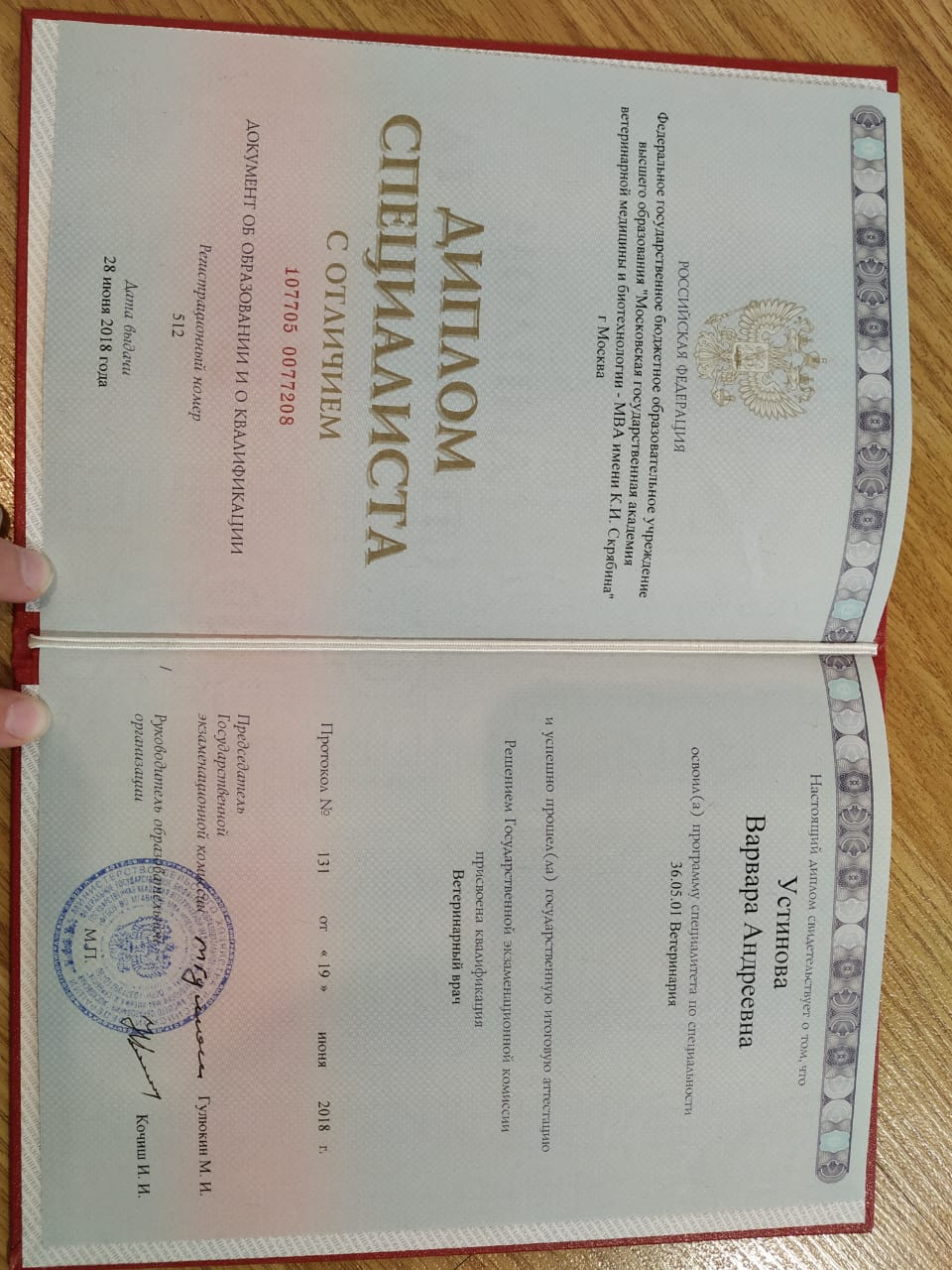 Образование: 2013 - 2018 гг. - Московская государственная академия ветеринарной медицины и биотехнологии — МВА имени К.И. Скрябина, Москва, Россия. Специальность ветеринарный врач, диплом с отличием.