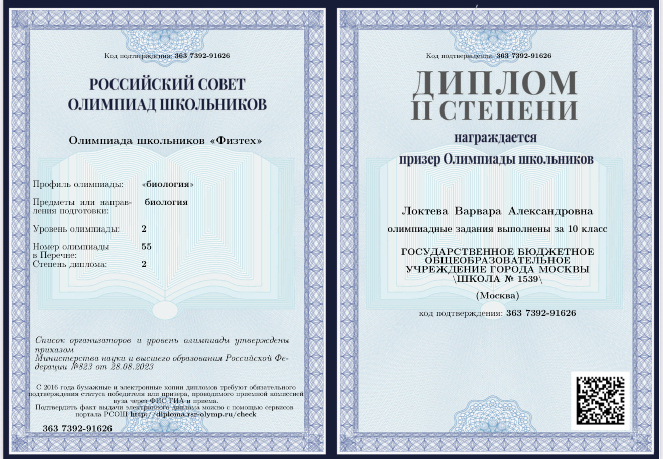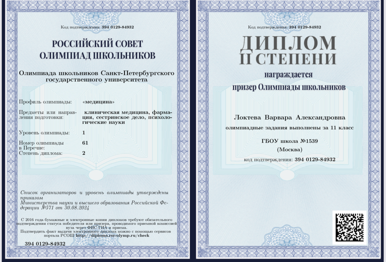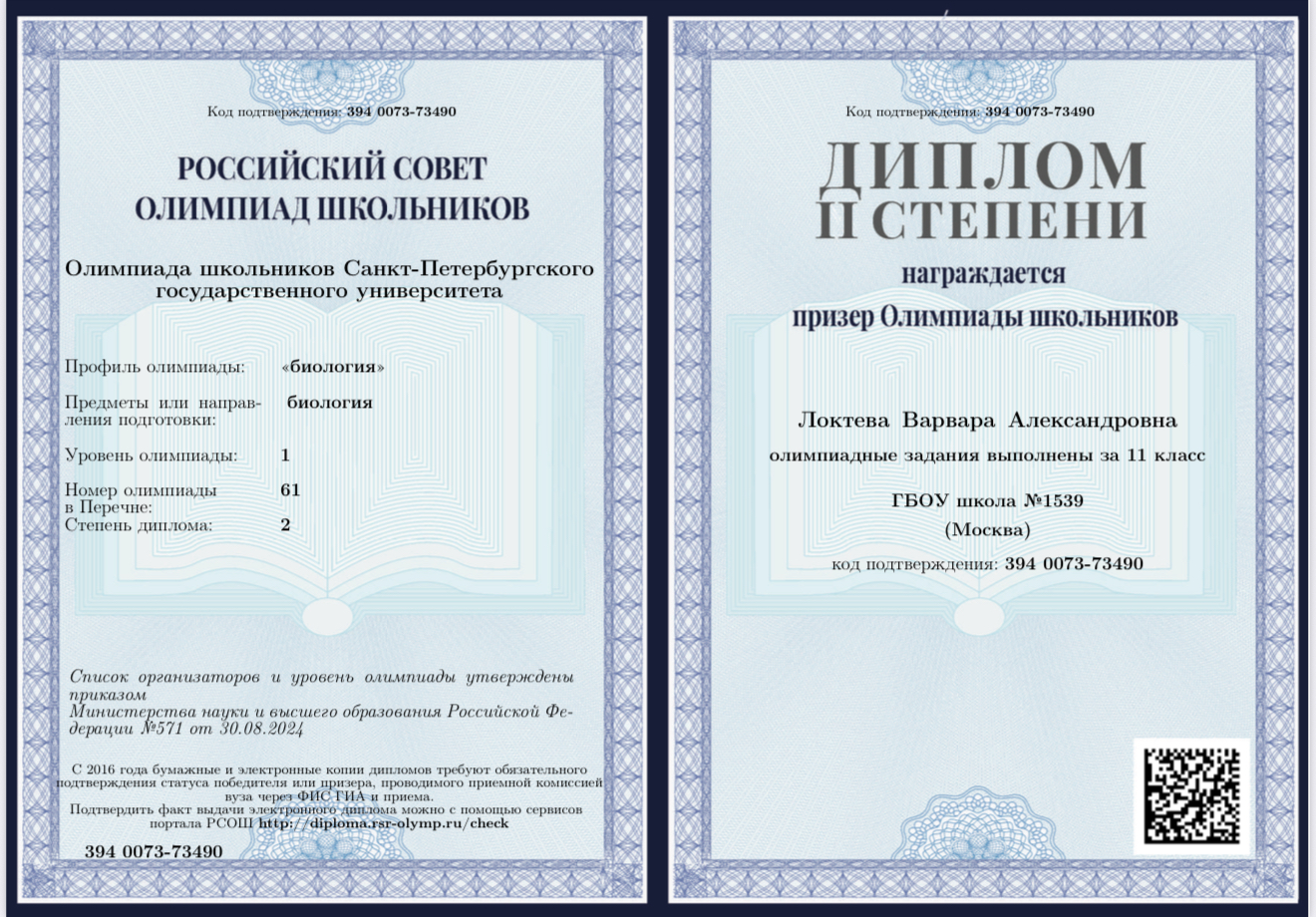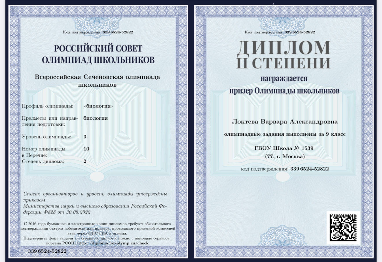Член сборной Москвы по биологии, участник ЗЭ ВСОШ по биологии, призёр олимпиады СПБГУ по медицине и биологии, призер олимпиады Физтех по биологии, призёр сеченовской олимпиады школьников по биологии.