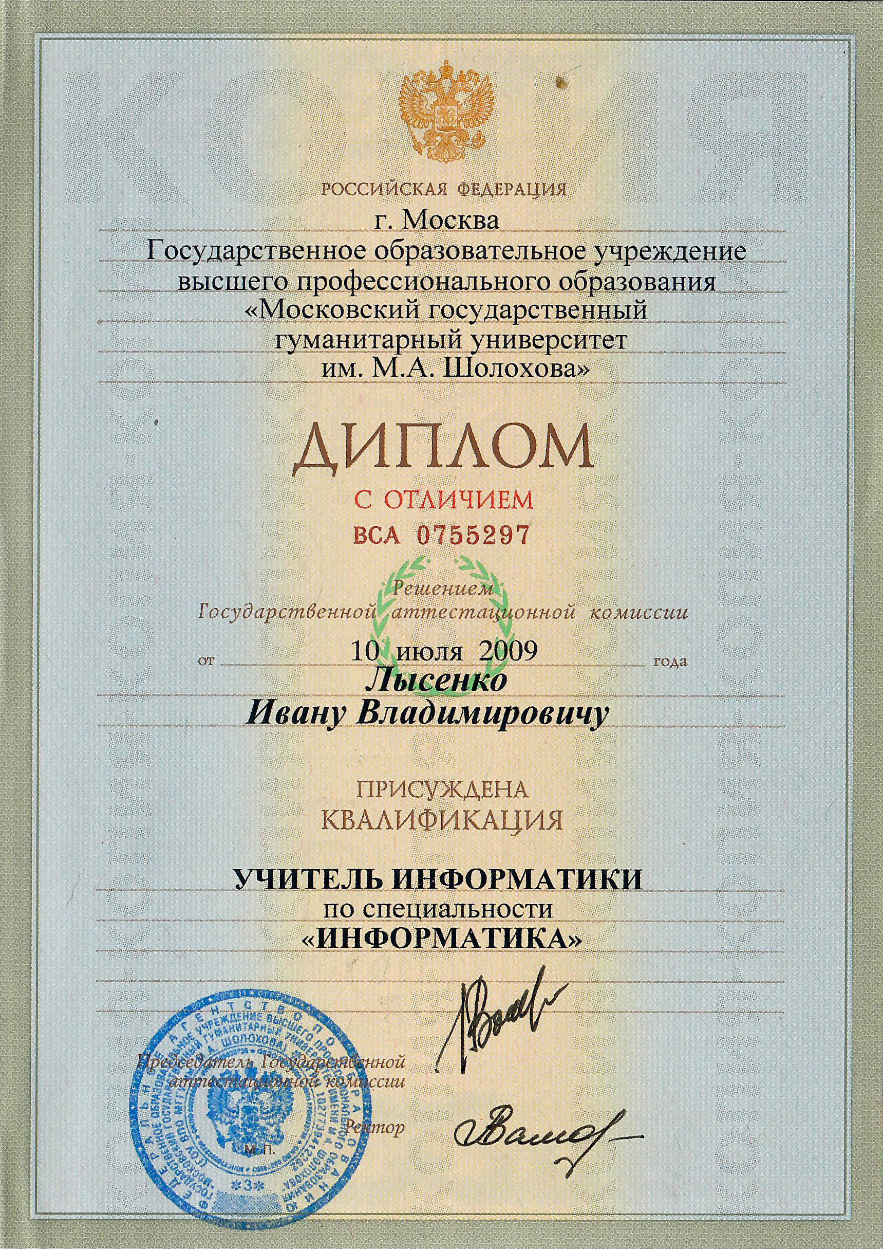 Получил сначала ср.специальное, а потом на его базе и высшее профессиональное педагогическое образование как “учитель информатики”.
