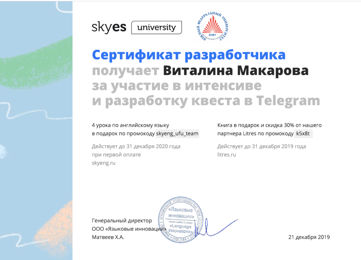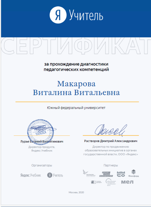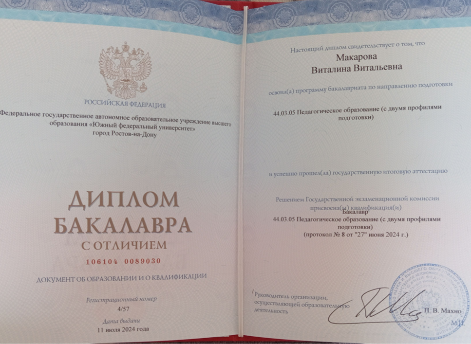 Образование: Красный диплом Южного Федерального Университета международного образца, "Педагогическое образование с двумя профилями подготовки (начальное образование и иностранный язык), бакалавр, 2024 год.