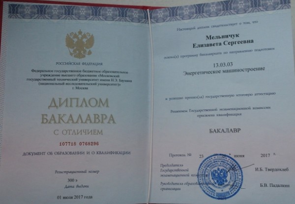 2017 окончила бакалавриат в МГТУ им. Н.Э. Баумана на факультете "Энергомашиностроение", специальность. "Гидромеханика, гидромашины и гидропневмоавтоматика" (Диплом с отличием)