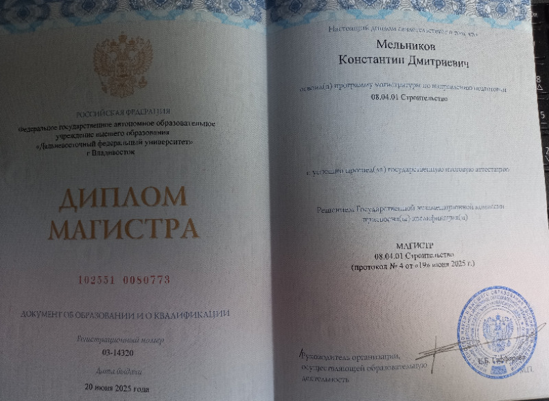 - Образование: Дальневосточный федеральный университет. Политехнический институт, магистр
