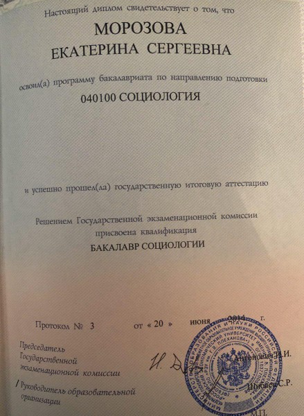 Образование: Образование: РЭУ им.Г.В.Плеханова, бакалавр социологии.