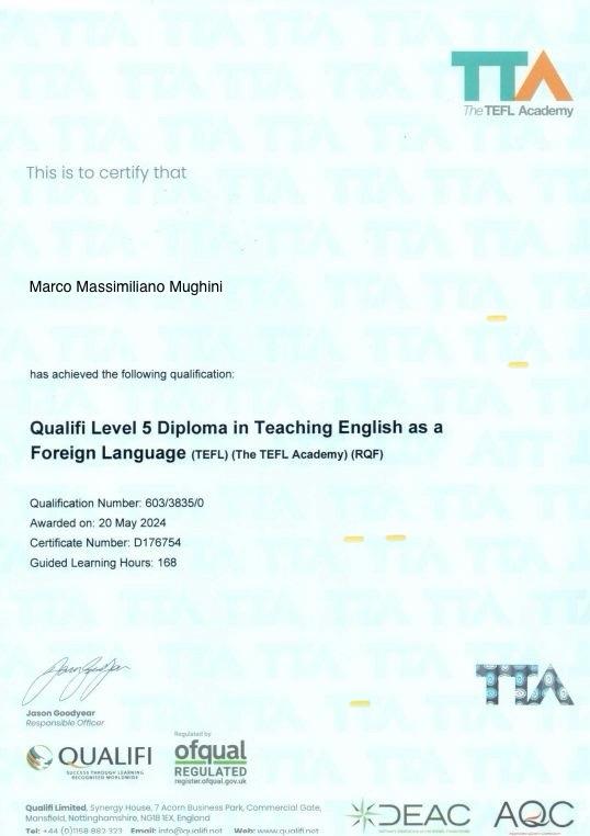 Здравствуйте! Я профессиональный преподаватель с дипломом TEFL 5 уровня и более чем 15-летним опытом преподавания английского и итальянского языков.