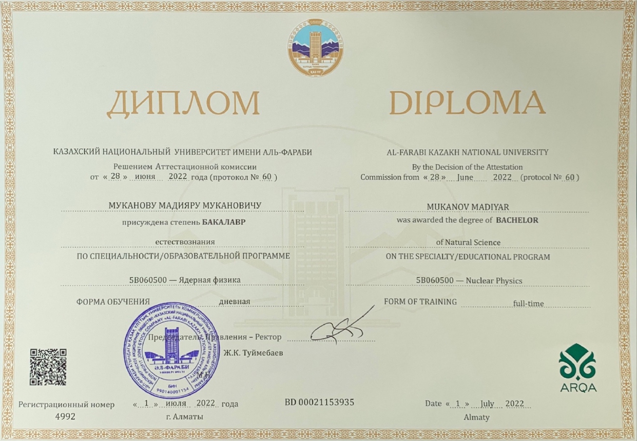 Окончил бакалавриат физико-технического факультета Казахского Национального Университета имени Аль-Фараби по специальности "Ядерная Физика". В данное время учусь на магистратуре в Satbayev University.