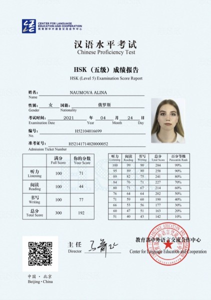 На данный момент обучаюсь в университете в Шанхае на английском и китайских языках, имею сертификат об успешной сдаче 5 HSK, совершенствую свой китайский постоянно, свободно общаюсь с носителями, смотрю фильмы и сериалы в оригинале.