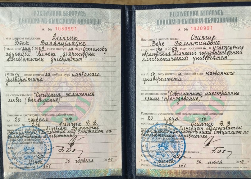 - Образование: МГЛУ (Минский государственный лингвистический университет), факультет французского языка, 2014 г.