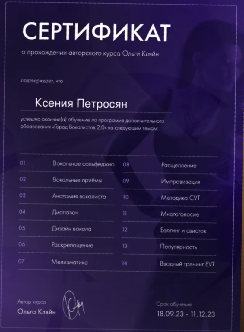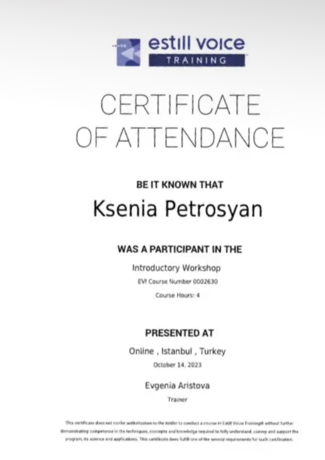 Образование: Международный сертификат Estil voice тренинг (анатомия вокалиста)