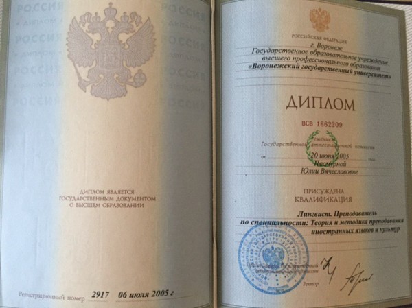 - Образование: ВГУ - преподаватель иностранных языков и культур, 2005 г.