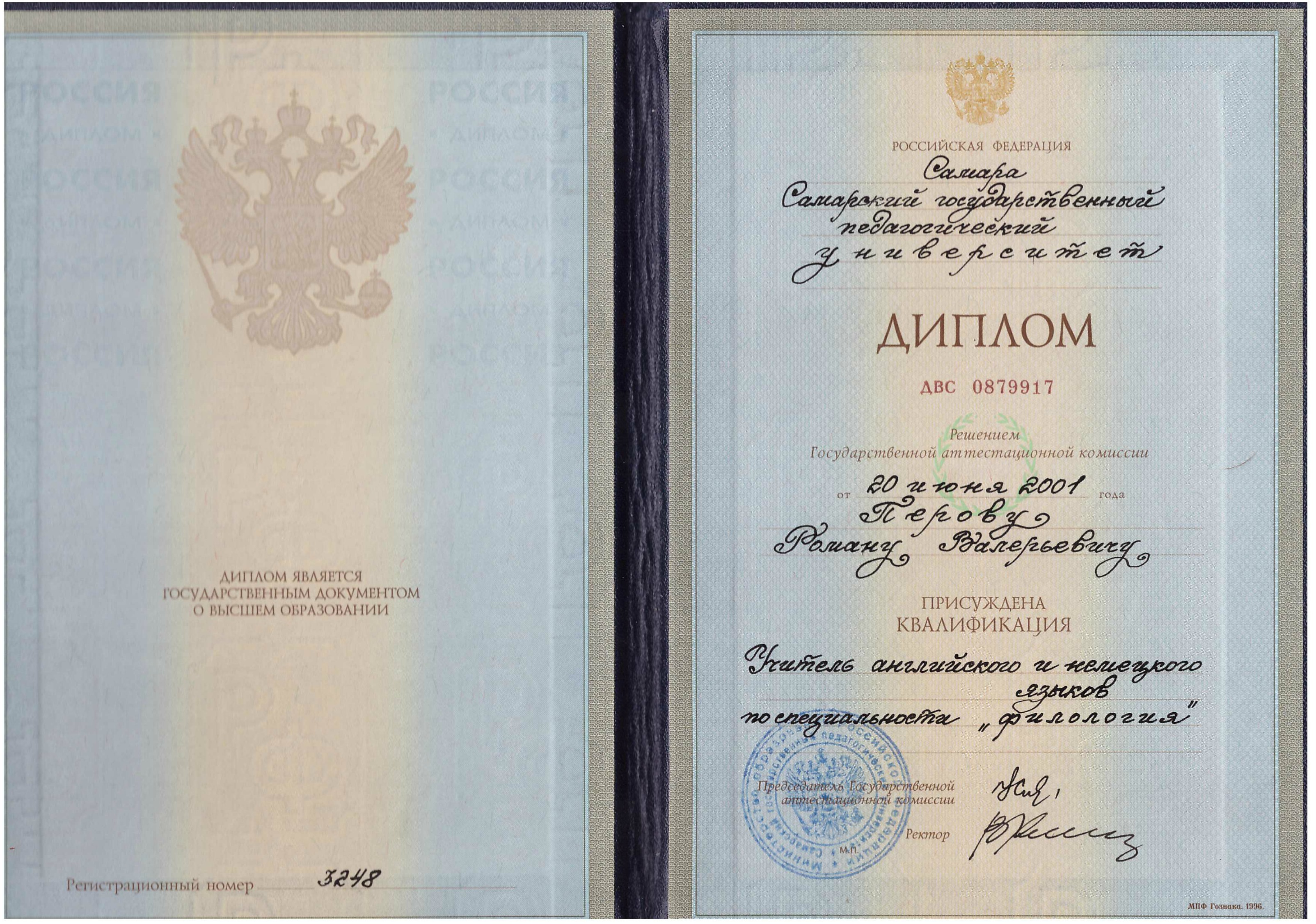 В 1996г я поступил, а в 2001г окончил Самарский государственный педагогический университет, факультет иностранных языков (английское отделение, специальность филология); в 2004-2007 продолжил обучение в очной аспирантуре по специальности 10.02.04 (германские языки).