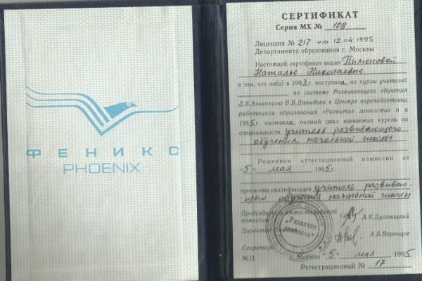 Курсы учителей по системе развивающего обучения Д.Б. Эльконина, В.В.Давыдова, окончила полный курс по специальности «учитель развивающего обучения начальной школы», 1993–1995 гг.