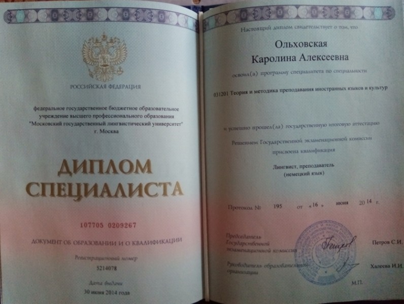 - Образование: Московский Государственный Лингвистический Университет (бывш. Ин.яз.), факультет немецкого языка, специальность - теория и методика иностранных языков и культур, год выпуска - 2014.